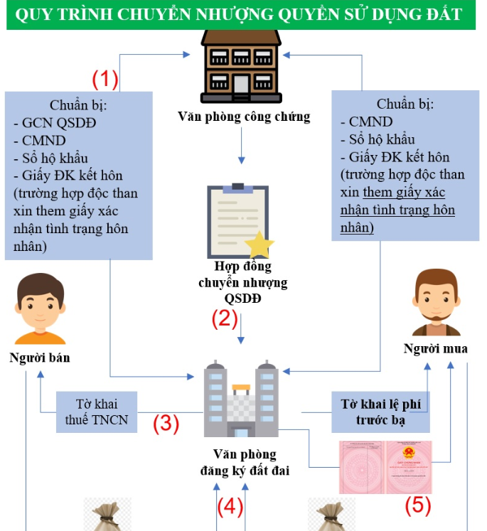 Dưới đây là quy trình chuyển nhượng nhà đất được áp dụng phổ biến và thống nhất tại nhiều địa phương trên cả nước bao gồm 6 bước cơ bản: Kiểm tra thông tin, Đặt cọc, Ký HĐ công chứng, nộp hồ sơ sang tên sổ đỏ, đóng thuế và nhận kết quả.