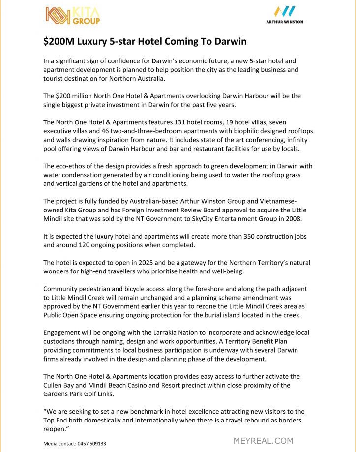 Tập đoàn Kita Group (Việt Nam) kết hợp với Tập đoàn Arthur Winston Group (Úc) phát triển Dự án khách sạn 5 sao siêu sang North One Hotel & Apartments trị giá 200 triệu đô tại thành phố biển Darwin nước Úc.