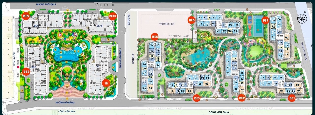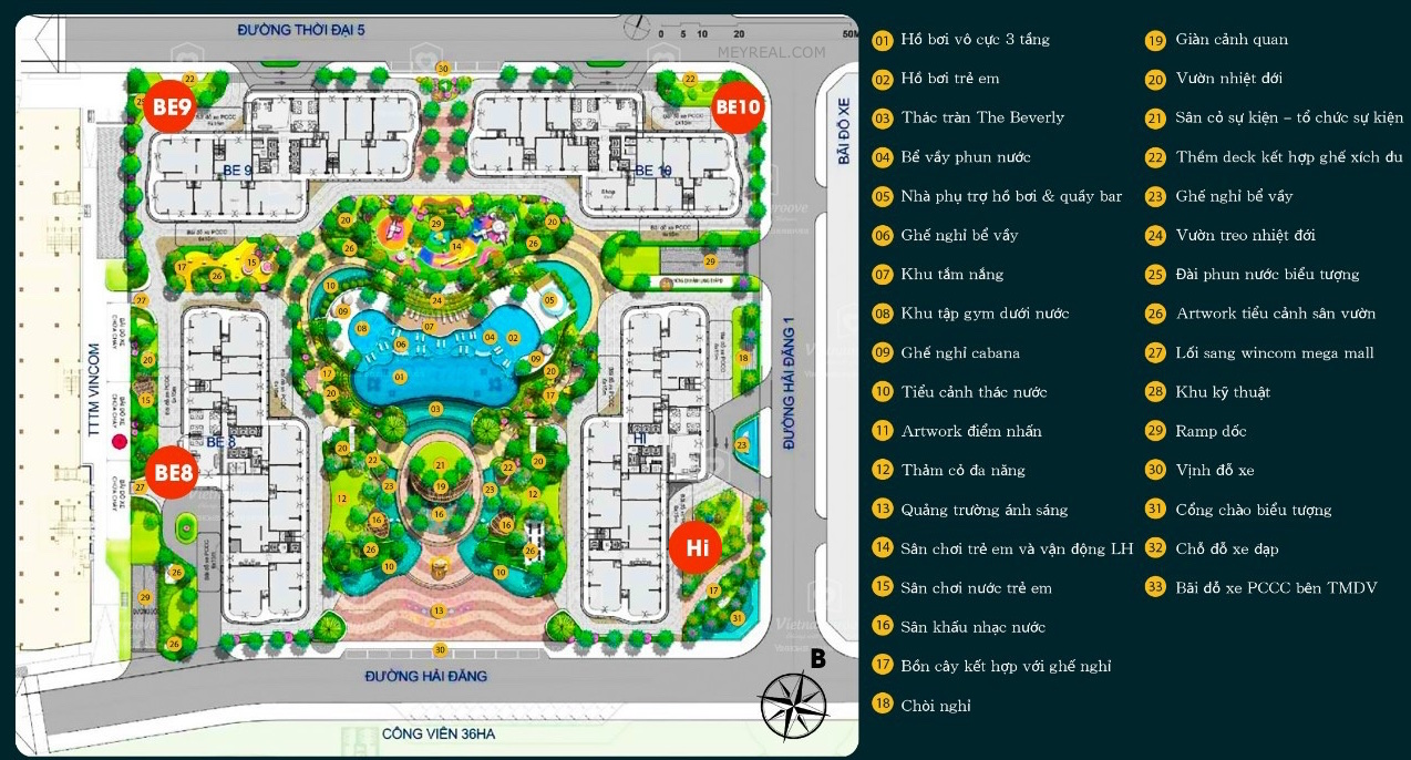 Khu căn hộ The Beverly Resort quy mô 6 block căn hộ BE1, BE2, BE5, BE6, BE7 với thiết kế đồng đều kiểu hình chữ Z, liền kề tiểu khu The Star – Beverly và Phân khu căn hộ The Miyako, cùng đường Hải Đăng rộng 24m bao quanh tiểu khu Resort.