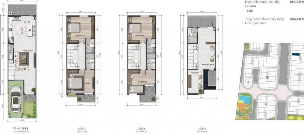 + Cụm 2 có 17 căn với 12 căn 5x19m, 2 căn bìa 7x19m và 3 căn góc 10x20m.
