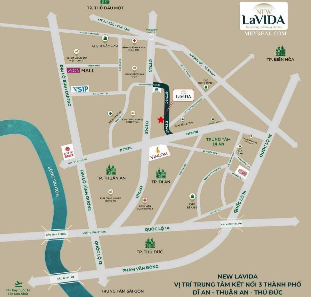 Dự án New Lavida có vị trí ngay mặt đường TL743C, gần với các khu công nghiệp VSIP, Sóng Thần, Đồng An, Tân Đông Hiệp, và còn tiếp giáp với các đô thị đang phát triển mạnh như: Thành phố Thủ Đức (TP.HCM), Thành phố Biên Hòa (Đồng Nai); Thành phố Thuận An – Tp. Thủ Dầu Một (Bình Dương).