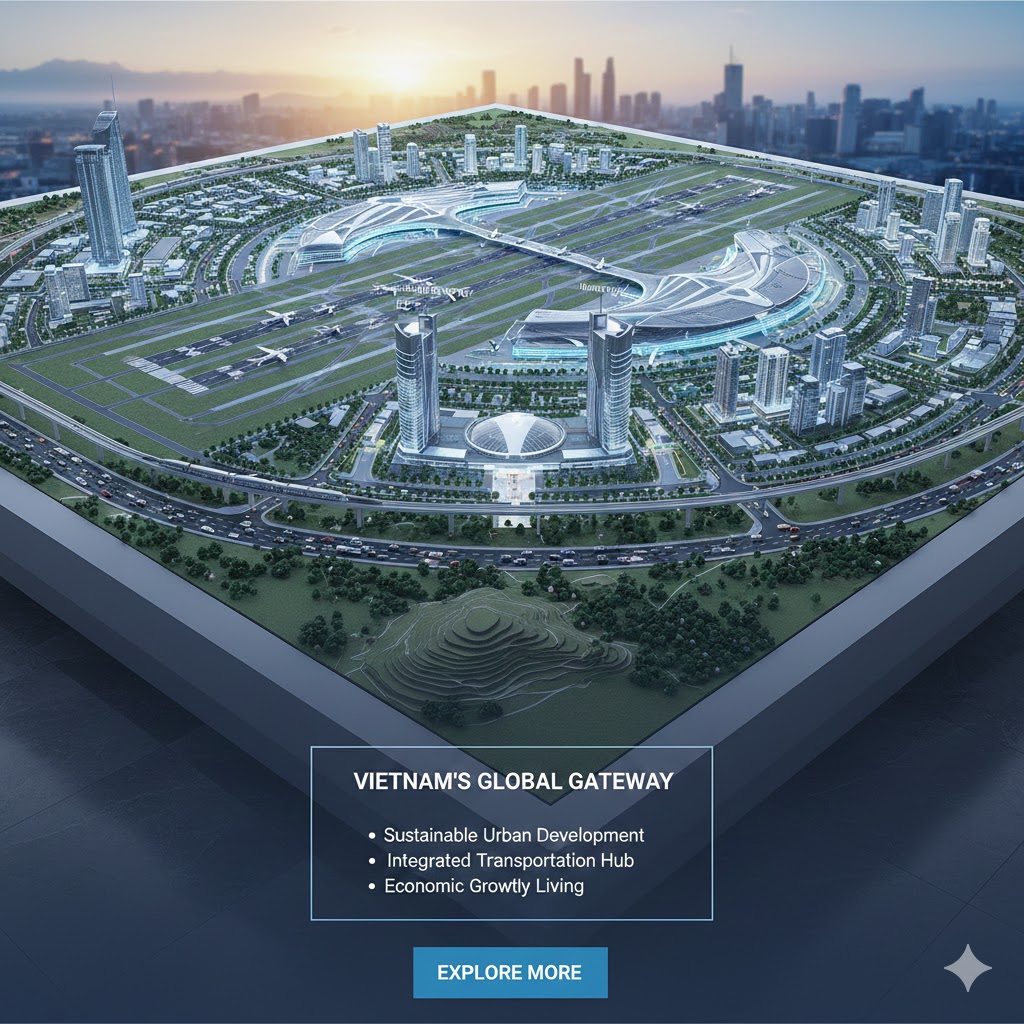 Long Thành được định hướng trở thành thành phố sân bay đầu tiên tại Việt Nam, mở ra không gian phát triển hoàn toàn mới cho Đồng Nai – TP.HCM – Bà Rịa Vũng Tàu và vùng Đông Nam Bộ.