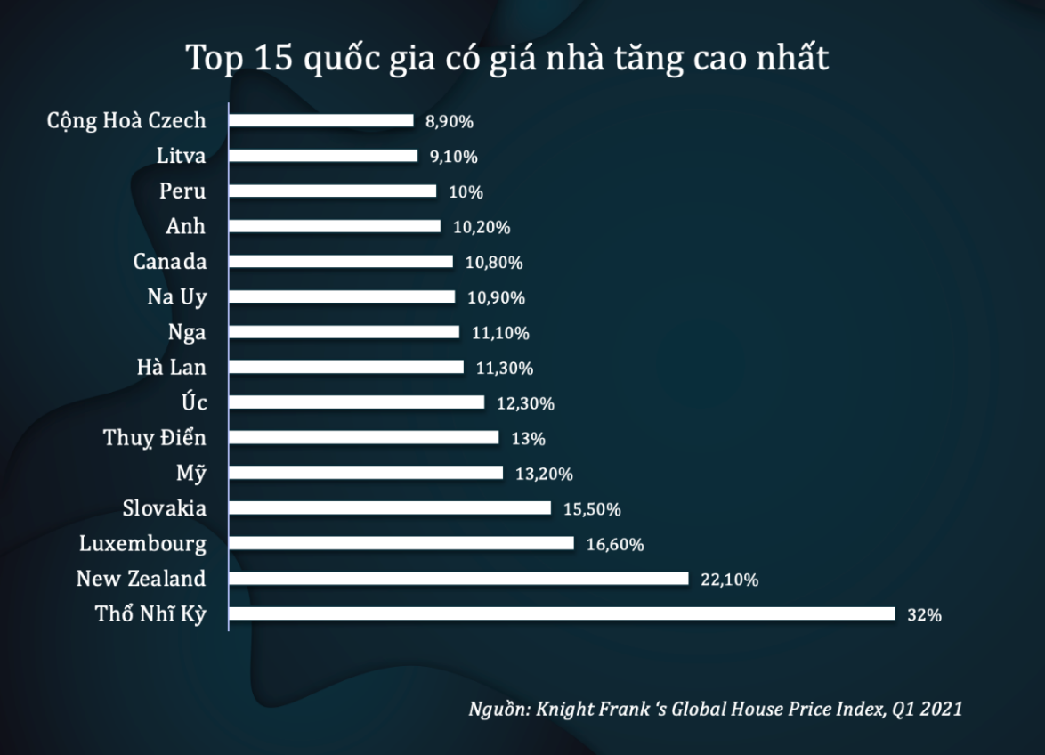 Tại Mỹ, theo báo cáo của Hiệp hội Môi giới Bất động sản quốc gia (NAR), giá nhà ở Mỹ tăng 23,6% trong vòng 12 tháng kể từ tháng 5/2020, và lập kỷ lục mới về mức tăng đối với lĩnh vực BĐS. Cùng với Mỹ, 14 quốc gia khác trên thế giới cũng đã ghi nhận sức nóng của thị trường Bất động sản ngay sau làn sóng Covid 19 lần đầu tiên.