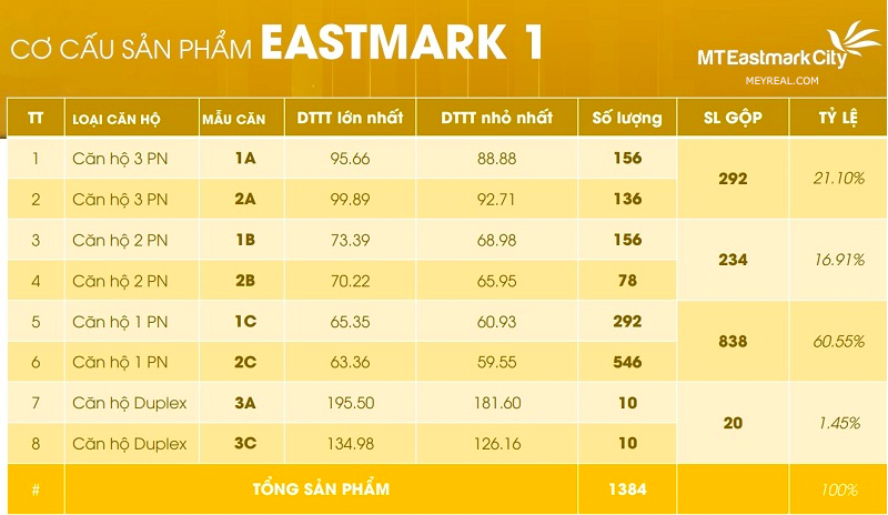 – Căn hộ cao cấp MT Eastmark City: 1.384 căn